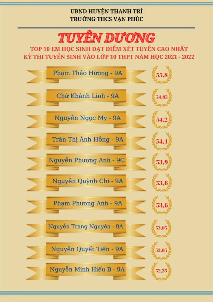 Thời gian trôi đi nhanh quá phải không các em? Các em lại đi qua một năm học nữa – cũng là năm học cuối cùng tại ngôi nhà lớn THCS Vạn Phúc thân thương, năm học đặc biệt với nhiều biến động, nhiều khó khăn. Bằng sự nỗ lực, cố gắng hết mình, 157 em đã vượt qua kì thi vào THPT. Và thật đáng mừng khi tỉ lệ đỗ vào THPT công lập đạt 91,1%. Trong đó 21% đạt tổng điểm xét tuyển là 50 điểm trở lên. Đặc biệt nhiều em đạt thành tích xuất sắc, mang lại niềm tự hào cho gia đình và nhà trường. Chúc mừng các em!